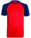 100% polyester wicking knit ; Wicks moisture away from the body ; Pad print label ; Contrast color, self-fabric collar and raglan sleeves ; Double-needle hemmed sleeves and fishtail bottom;